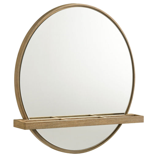 This wall-mounted vanity mirror blends modern sophistication with natural coastal warmth. A round wood frame in a soft sand wash finish highlights ...