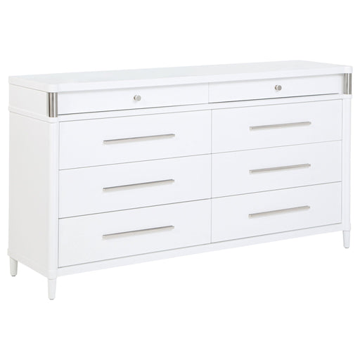 View full detailsThis eight-drawer dresser exudes modern sophistication through a sleek silhouette and softened edges. Elongated brushed nickel pulls and vertical t...