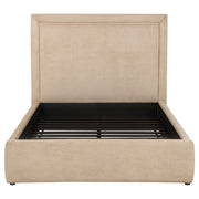 Clean lines and understated elegance define this platform bed, wrapped in smooth upholstery from base to headboard. The simple panel design offers a tailored profile, softened by subtle padding and low foot rails for an inviting finish. With a fully slatted foundation, this bed supports a mattress directly, no box spring needed. Perfect for modern minimalists or transitional spaces, it balances comfort and clarity in a sleek, grounded silhouette. Key Features: • Queen bed with clean panel headboard and fully upholstered low-profile frame • Light saddle fabric adds warm tone and soft texture with a neutral foundation • Padded headboard delivers comfort and structure in an understated silhouette • Platform base with slats eliminates need for a box spring or foundation • Crafted with engineered wood, and supportive foam fill • Perfect for transitional or modern bedrooms with a minimalist focus