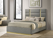 Modern elegance meets clean geometry in this upholstered panel bed, inspired by contemporary Italian aesthetics. A tall headboard is accented with vertical gold acrylic strips that create striking visual contrast and refined symmetry. The footboard features a matching gold base detail that adds polish from every angle. Wrapped in soft woven fabric and built on a durable frame, this bed delivers luxury, structure, and long-lasting support. Key Features: • Queen panel bed with tall headboard and bold modern Italian-inspired silhouette • Upholstered in grey fabric with subtle woven texture and a soft, tailored appearance • Vertical gold acrylic strips add sculptural contrast to the clean-lined headboard • Gold-accented footboard base provides a polished and elevated finishing detail • Crafted from engineered wood, fabric, and foam for strength and durability • Foundation is required to complete the mattress support system