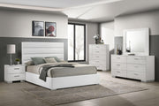 Elevate your bedroom with the sleek sophistication of this contemporary bedroom set. The panel bed features a clean-lined white high gloss headboard and a faux leather upholstered frame, delivering a refined yet modern aesthetic. Chrome-finished accents add a polished touch, while smooth-gliding drawers ensure effortless functionality. Designed for both style and durability, this set brings a fresh, minimalist feel to any space. Key Features: • Modern bedroom set showcasing a sleek and minimalist panel bed design • White high gloss headboard provides a clean, polished, and contemporary look • Bed frame upholstered in smooth, durable, and soft faux leather for comfort • Storage pieces feature spacious drawers with smooth metal extension glides • Chrome-finished metal handles and feet enhance the sleek, modern aesthetic • Designed for long-lasting durability while offering everyday functionality