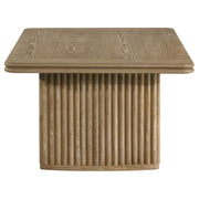 This rectangular coffee table brings sculptural structure and natural warmth to any living room. The rounded-edge tabletop rests on dual curved pedestal bases, each detailed with vertical reeding for visual rhythm and balance. Finished in a distressed light brown tone, the piece blends organic texture with architectural design. Built from engineered wood and ash veneer, this coffee table serves as a grounding focal point for contemporary and transitional spaces. Key Features: • Rectangular coffee table with softly rounded corners and smooth top • Distressed light brown finish emphasizes the wood's tonal variation • Dual curved pedestal base panels feature vertical reeding detail • Broad surface area provides functional space for decor and daily use • Made from engineered wood and ash veneer for durability and style • Ideal for modern or transitional living rooms seeking warmth and form