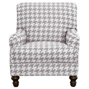 View full detailsA standout houndstooth check pattern draws due attention to this fashionable accent chair. With tailored English arms and turned legs offering a co...