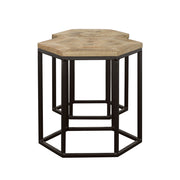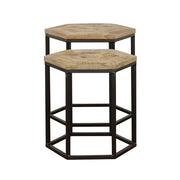 Add a modern geometric touch to your space with this two-piece nesting table set, designed for both functionality and visual appeal. Featuring solid mango wood hexagonal tops, these tables showcase the natural wood grain for a warm, organic look. The sleek black iron frames, crafted in a matching hexagonal silhouette, provide a bold contrast while ensuring durability and stability. Nest them together to save space or use them separately for added surface area. Perfect for living rooms, lounges, or contemporary interiors, these tables blend industrial and modern aesthetics effortlessly. Key Features: • Geometric hexagonal tabletops crafted from solid mango wood • Matte black iron frames add durability with a modern edge • Nesting design allows for space-saving versatility • Sleek, open base enhances an airy, contemporary feel • Perfect for living rooms, lounges, or accent seating areas • Blends modern, industrial, and minimalist aesthetics seamlessly