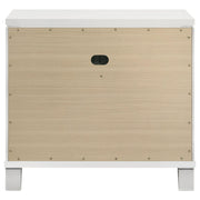 Complete your bedroom ensemble with this elegant 2-drawer nightstand, designed with a modern Italian aesthetic. The white finish, accented with mirror framing and polished chrome metal hardware, creates a striking look. Featuring picture framed recessed panels with an embossed herringbone graphic pattern, this nightstand offers both style and functionality. The top drawer includes cord management access, making it perfect for your rechargeable devices. Crafted from rubberwood, MDF, and mirror, this nightstand is a luxurious addition to any bedroom. Key Features: • 2-Drawer modern Italian design with a striking white finish • Picture framed recessed panels with embossed herringbone graphic patterns • Mirror framing and polished chrome metal hardware • Top drawer includes cord management access • Crafted from rubberwood, MDF, and mirror
