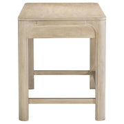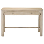 Graceful form meets refined function in this two-drawer vanity desk, designed as both a writing surface and makeup table. Sculpted legs and rounded corners soften the silhouette, while two felt-lined drawers keep beauty tools or daily essentials neatly stored. Finished in weathered mango, its surface reveals natural wood grain. Built from mahogany, engineered wood, and mango veneer, it brings elegance to any bedroom or dressing space. Key Features: • Vanity desk with sculpted legs and curved edges for a soft, modern makeup table profile • Weathered mango finish highlights natural grain with relaxed, neutral wood tones • Two felt-lined drawers offer soft storage for cosmetics, brushes, or essentials • Cross-stretcher base provides visual stability and structural integrity • Crafted from mahogany, engineered wood, and mango veneer for durability • Ideal as a makeup table or writing desk in bedrooms, dressing areas, or home offices