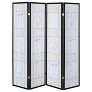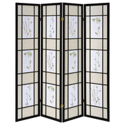The world may be getting smaller, but some things still warrant privacy. Put on makeup or fill up a diary in secret behind this four-panel screen. Framed in black, panels can be pulled close or extended to customize your secrecy. Panel screens come in a floral print that's feminine and artsy. Use it to divide a room or put in front of a window to keep things intimate. Key Features: • Four panel screen with printed floral detail • Wood frame in black finish • Floral fabric panels framed in stained glass style • FSC certified wood frame • Rubberwood construction
