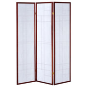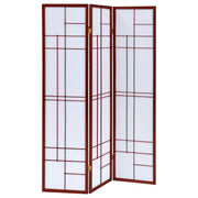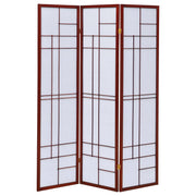 Enhance your space with this Japanese-inspired three-panel shoji screen, designed with slim linear details that create a striking geometric look. The warm cherry-finished wood frame offers a rich contrast against the crisp white paper panels, blending traditional style with contemporary appeal. Flexible hinges allow the panels to fold and adjust, making it perfect for dividing a room, adding privacy, or serving as an accent piece. Crafted from FSC-certified rubberwood with durable fabric, this screen balances function and artistry._x005F_x000D_ Key Features: • Three-panel room divider with Japanese-inspired slim linear geometric design • Cherry-finished wood frame provides warmth and elegant contemporary appeal • White paper fabric panels create contrast and soften natural or artificial light • Durable construction from FSC-certified rubberwood ensures lasting quality • Hinged panels fold easily to adjust layout for privacy or decorative function • Functions as both a practical divider and a stylish accent for modern interiors