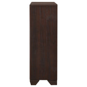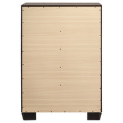 Mid-century modern-inspired, the silhouette of this five-drawer chest adds a retro feel to a contemporary space. Radiate sophistication with a washed taupe finish that highlights a stunning exposed wood grain. Refined and stylish, delicately tapered legs combine with metallic drawer pulls. Emphasize the warm hues and variations in the natural oak with the smooth and sleek edges. Add contrast with black recessed grooves around picture framed case drawer fronts. Key Features: • Five-drawer chest with clean lines and weathered light wood finish • Washed taupe surface reveals oak-inspired grain for rustic-modern charm • Black recessed grooves outline drawers for added dimension and contrast • Chrome drawer handles provide a contemporary accent to the neutral tone • Compact, vertical design offers efficient storage for clothing or linens • Constructed from engineered wood and scratch-resistant paper laminate veneer
