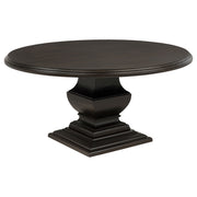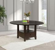 Create a stylish and functional dining area with this transitional round dining table. Featuring a spacious 60-inch tabletop in a rich, dark cocoa finish, this table makes a striking centerpiece for any dining room. The pedestal base includes two drawers for storing essentials and an open bottom shelf, perfect for displaying decor or keeping items within reach. With enough room to comfortably seat six, this elegant piece is ideal for both everyday meals and more formal gatherings, making it versatile enough for any occasion. Key Features: • Elegant and functional round dining table with a 60-inch diameter • Designed with a pedestal base that includes storage in a convenient drawer • Features an open bottom shelf for displaying decor or storing essentials • Dark cocoa finish complements both traditional and modern decor styles • Constructed from durable rubberwood and oak veneer for lasting quality