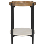 Complete your living space with this chic side table, blending organic materials with sleek modern design. The beautiful round mango wood top showcases unique grain patterns, while a white marble shelf below adds a touch of luxury. Supported by slender black iron legs, the end table offers sturdy support without overwhelming your space. Whether used as an accent or a functional piece, this versatile side table seamlessly blends style and practicality. Elevate the aesthetics of your home with this refined yet natural addition. Key Features: • Round end table crafted from mango wood, marble, and iron • Recessed solid wood top highlights natural grain variations • White marble shelf adds luxury and extra display or storage space • Slender black iron legs provide sturdy support with a minimalist look • Perfect blend of organic charm and modern style for a versatile accent piece