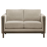 View full detailsModern lines and plush comfort come together in this upholstered loveseat, designed for relaxed refinement. A engineered wood frame in a rich coffe...