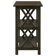 Bring an energizing look to a transitional space. With linear styling and geometric x-shapes on its side panels, this console table creates an eye-catching effect. Deep merlot offers a scrumptious, dramatic finish that blends well with surrounding furnishings. Find plenty of shelf space to match its rectangular surface. Place behind a sofa or against a wall for a central focus. Key Features: • Console table with rectangular top and two open lower shelves for storage and display • Deep merlot finish enhances visual warmth with a rich, dark wood tone • Geometric X-side panel design adds decorative structure and open feel • Designed to function as an entryway table, sofa table, or hallway focal point • Crafted from rubberwood, engineered wood, and rubberwood veneer • Durable shelves offer added support for everyday essentials and decor items