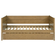 The transitional-style panel daybed with trundle features a natural brown finish that highlights its rustic charm and versatile appeal. Constructed from pine wood, plywood, MDF, and pine veneer, this piece combines durability with timeless design. The natural wood variations, interacting with the applied finish, make each piece truly unique. Included slats provide sturdy mattress support, while the trundle, equipped with four wheels, glides smoothly for convenient additional sleeping space. Key Features: • Transitional-style daybed with trundle enhanced by a warm natural brown finish for added charm • Unique natural wood variations interact with the finish, giving each piece distinct character • Sturdy construction with pine wood, plywood, engineered wood, and pine veneer ensures durability • Smooth-gliding trundle fitted with four wheels for effortless mobility and extra sleeping space • Included slats offer reliable mattress support and ventilation, eliminating the need for a foundation • Combines functionality and rustic appeal for a timeless, space-saving solution