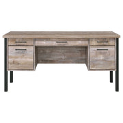 Infuse your office space with stylish simplicity. With a rustic, aged oak finish, this office desk exudes classic charm. Its strong silhouette is brought to life by crisp, clean lines of bold, black metal. Complete with five spacious storage and file drawers, this desk makes it easy to stay organized. Complete with euro glides and high-quality craftsmanship, it's the ultimate in durable practicality. Key Features: • Industrial-inspired office desk with weathered oak top and black metal frame • Includes four drawers and one cabinet for storage and organization • Engineered wood top offers spacious work surface with laminate coating • Flat black drawer pulls complement minimalist modern styling • Ideal for home offices needing concealed file and supply space • Durable, functional design supports both remote work and study setups