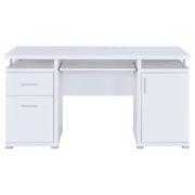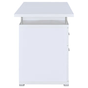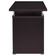 Upgrade your home office with sleek style and fabulous functionality. This handsome office desk has everything you need to be productive. Its large cabinet features an adjustable shelf for convenient storage. It includes a large file cabinet that fits legal and letter size files, as well as a smaller top drawer and keyboard tray. With a deep, rich finish of cappuccino, this desk is a stylish addition to any office. Key Features: • Office desk with cappuccino finish and modern rectangular work surface • Two drawers include a utility drawer and a file drawer for organized storage • Right-side cabinet with adjustable shelf provides versatile enclosed storage • Slide-out keyboard tray preserves desktop space and improves workflow • Silver-finished hardware and metal risers create a clean, professional look • Crafted from engineered wood, melamine paper, and honeycomb board layers