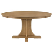 Gather around a dining set that evokes comfort, tradition, and effortless beauty. The round pedestal table anchors the space with a graceful silhouette and natural light brown finish that reveals the rich character of white oak veneer. Slat-back chairs with gently contoured frames and softly padded light tan seats invite relaxed conversation and lingering meals. Thoughtfully crafted for both charm and everyday use, this set brings enduring warmth to any dining room. Key Features: • Dining set features a round pedestal table and slat-back chairs in a natural wood finish • Sixty-inch tabletop offers a spacious setting for meals, celebrations, and conversation • Chair backs are gently sculpted for ergonomic comfort and traditional appeal • Light tan upholstered seats provide soft contrast and everyday comfort • Crafted from solid rubberwood, engineered wood, white oak veneer, and fabric materials • Versatile design complements traditional, rustic, and transitional dining spaces