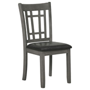Update that boring dining room with this stylish and practical 5-piece dining set from the Lavon collection. The popular medium grey finish is a new option to highlight the transitional styling of this bestselling collection. Perfect for families, the storage pedestal base table offers not only hidden storage but an open display shelf as well. To accommodate additional guests, simply use the 18-inch extension leaf to convert the round table to an oval shape. The classic lattice back chairs feature added comfort in the form of cushioned seats upholstered in supple black leatherette. Key Features: • Five-piece dining set with oval table and four matching lattice back chairs • Medium grey finish highlights the transitional silhouette and wood grain texture • Eighteen-inch extension leaf expands the tabletop from round to oval shape • Pedestal base includes lower shelf and hidden compartment for functional storage • Chair seats upholstered in smooth black leatherette for added comfort • Crafted from solid hardwood, engineered wood, and foam-filled seat cushions