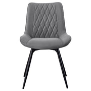 Return to a retro vibe in your casual dining space, adding this five-piece dining set to bring a soft, light feel. A round dining table anchors this tasteful set, featuring a gray faux marble top and a stylish geometric gunmetal finish iron base with hairpin-inspired legs. Side chairs are as comfy as can be with a gently angled seat back and foam-padded seat, all upholstered with soft gray fabric and dressed up with quilting detail. Swivel mechanisms add convenience to each chair, and retro-like round, tapered legs ups the ante on attitude. Set includes one dining table and four side chairs. Key Features: • Retro-vibe dining set with round table and four side chairs • Table features gray faux marble top and gunmetal finish iron base with hairpin-inspired legs • Side chairs feature foam-padded seat, upholstered with soft gray fabric and quilting detail, swivel mechanisms, and round, tapered legs • Bring a soft, light feel to your casual dining space • Complete the look with one dining table and four side chairs