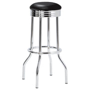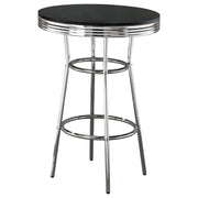 Step back in time with this exquisite 3-piece pub height bar table set, perfect for adding a touch of retro elegance to any space. The gleaming chrome base and laminate tabletop evoke the charm of a 1950s soda fountain, making every meal feel special. The set includes two matching backless swivel bar stools, upholstered in leatherette, bringing comfort and style to your gatherings. Whether you're enjoying a casual breakfast or an evening drink, this set transforms your space into a nostalgic yet sophisticated retreat. Embrace the perfect blend of past and present with this timeless ensemble. Key Features: • "Three-piece pub height bar table set includes one table and two backless stools • 1950s retro style with white laminate tabletop • Electroplated chrome metal base with iconic ribbed apron_x005F_x000D_ • Stools feature swivel functionality and cool white leatherette upholstery_x005F_x000D_ • Constructed from steel and MDF for durability and style_x005F_x000D_