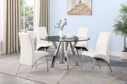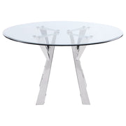 Sculptural style instantly elevates the modern glam aesthetics of a contemporary dining table. The rectangular table is topped with beautiful clear glass, complete with an elegant beveled edge for a polished look and feel in your dining room. Flared, geometric legs add sophistication and artistry, certain to capture attention for everyday dining or elegant entertaining of friends and family. A polished chrome finish brightens the look of the table and offers a neutral complement that glistens in the light. Clean and precise in style, this modern dining table is a gorgeous choice for your sophisticated space. Key Features: • Sleek rectangular glass top with beveled edge for a polished look • Flared, geometric legs add sophistication and artistry • Polished chrome finish brightens the look of the table • Clean and precise in style, perfect for everyday dining or elegant entertaining • Instantly elevates the modern glam aesthetics of a contemporary dining room
