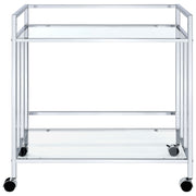 Welcome guests and serve up libations with this sleek contemporary bar cart. A rectangular silhouette outlined in a slim, square metal frame lends an Art Deco-inspired aesthetic to dining spaces and more. The polished, metallic finish elevates it even further, pushing the modern glam expression. Slide this luxe bar cart against a wall or glide it into the next room as you host parties, with the help of its lockable caster wheels. Two clear tempered glass shelves allow you to showcase your favorite bottles and barware. Key Features: • The slim metal frame and round silhouette slips into corners effortlessly • Two tiers of clear tempered glass shelves for ample storage • Exquisite brass-plated metallic finish offers a glam touch • Three top side rails rest against walls elegantly • Smoothly glide this bar cart with the lockable caster wheels • Handcrafted from premium metal with refined sophistication