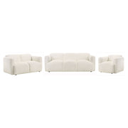 This sculptural sofa set blends soft curves with modern simplicity for a cozy, elevated lounge experience. Each piece is wrapped in richly textured fabric and designed with a low-profile frame, rounded edges, and wide track arms that invite you to unwind. High-quality foam and pocket coil seating ensure supportive comfort that lasts. With its seamless silhouette and tactile finish, this sofa set offers minimalist warmth and relaxed sophistication for any contemporary living space. Key Features: • Sofa set with rounded silhouettes and low-profile frames for sculptural modern appeal • Upholstered in textured white fabric with soft feel and warm visual dimension • Curved track arms and continuous lines create an inviting, enveloping shape • High-density foam cushions provide plush comfort across all seating areas • Pocket coil seating delivers long-lasting support and maintains structure • Perfect for modern living spaces seeking soft form and relaxed sophistication