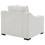 Elevate your transitional living room with this contemporary upholstered seating set, featuring a white trillium polyester blend fabric that covers elegant sloped track armrests as well as reversible box seat and back cushions with top stitching details. Block style legs in a handsome, bold cappuccino finish lend a striking contrast to the clean white upholstery. Matching accent pillows offer extra comfort and unify the seating pieces together.