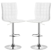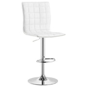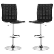 Intersecting vertical and horizontal stitching creates appealing waffle texture on this contemporary adjustable barstool. Easily rising and lowering to meet your special needs, this stool offers a modern silhouette with comfortable and supportive seating. Upholstered in black leather-look fabric, chrome accents add gleaming flair. A pedestal base with a round foot delivers a familiar but stylish profile. A built-in footrest encourages friends and family to linger over a great drink or delicious dessert. Key Features: • Intersecting vertical and horizontal stitching creates appealing waffle texture on this adjustable barstool with modern silhouette and comfortable seating • Upholstered in black leather-look fabric, chrome accents add gleaming flair to pedestal base with round foot • Easily rising and lowering to meet your special needs, built-in footrest encourages friends and family to linger • Chrome accents add gleaming flair to modern silhouette with comfortable and supportive seating • Pedestal base with round foot delivers a familiar but stylish profile