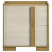 Complete your bedroom's modern elegance with this exquisite nightstand, perfectly designed to match your stylish bed. Inspired by contemporary Italian design, the nightstand features a sleek blend of natural wood tones and crisp white panels crafted from durable, easy-care melamine. The drawers, equipped with metal extension glides and pin-construction joinery, ensure smooth operation and lasting durability. The vertical lines of the natural finish hardware add a touch of sophistication, echoing the bed’s elegant design. Enhance your nighttime routine with this stylish and functional piece, offering a perfect blend of beauty and practicality. Key Features: • Nightstand designed to match a modern, stylish bed • Crafted with durable, easy-care melamine in a sophisticated 2-tone effect • Metal extension drawer glides and pin-construction joinery for smooth operation and durability • Natural hardware finish with vertical lines for a contemporary look • Two spacious drawers provide ample storage for bedside essentials