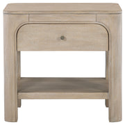 Graceful curves and purposeful details come together in this sculpted nightstand, a quiet companion for evening routines. A single drawer provides tucked-away storage, while an open shelf keeps essentials close at hand. Integrated USB-A and USB-C ports bring modern convenience to bedside living. Crafted from mahogany, engineered wood, and mango veneer, it blends softness, structure, and function in one elegant piece. Key Features: • One-drawer nightstand with rounded corners and sculpted base for soft, structured form • Weathered mango finish adds natural texture and relaxed, organic character • Felt-lined drawer protects jewelry, glasses, or small essentials with gentle lining • Dual USB-A and USB-C ports offer modern charging access right at your bedside • Open lower shelf keeps books, baskets, or nighttime necessities within easy reach • Crafted from mahogany, engineered wood, and mango veneer for lasting quality