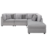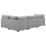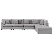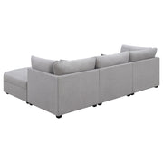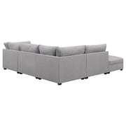 This modular sectional sofa embodies contemporary comfort with clean lines, inviting textures, and customizable flexibility. Upholstered in soft grey fabric, it features supportive cushions wrapped in plush feather-down for an indulgent seating experience. Subtle wedge details and tapered block feet lend modern refinement, while the modular design allows each piece to adapt effortlessly to any space. Perfect for family gatherings or relaxed lounging, it delivers style, durability, and lasting comfort in one cohesive design._x005F_x000D_ Key Features: • Modular sectional sofa with soft grey upholstery offers modern style and plush comfort • Configurable design allows flexible seating layouts for any living room arrangement • Hidden storage ottoman adds versatility for blankets, pillows, or everyday essentials • Plush feather-down wrapped cushions deliver inviting comfort and long-lasting support • Tapered block feet and subtle wedge details enhance its contemporary refined profile • Perfect for relaxing, entertaining, or family gatherings in a cozy modern setting
