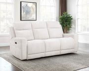 Sink into the soft embrace of this chenille power reclining sofa, where comfort meets thoughtful design. Smooth dual recliners respond at your touch. Built-in USB-A and USB-C ports keep your devices charged as you relax. Wrapped in richly textured chenille and supported by a durable metal frame, this sofa brings modern ease and everyday indulgence to your living space. Key Features: • Dual recliners operate via smooth push-button control • Ivory chenille upholstery showcases a soft surface with subtle woven texture • Features a built-in USB-A and USB-C port for dual-device charging convenience • Padded armrests and supportive headrests enhance lounging and relaxation • Durable metal framing ensures strength and lasting structural integrity • Polyester chenille offers a cozy feel with easy-care, low-maintenance appeal