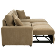 Tailored for comfort and designed for flexibility, this sleeper sectional blends sculptural form with practical function. Wrapped in soft upholstery, it offers plush cushions and deep seating for everyday lounging. A hidden pull-out bed provides an instant sleep solution for guests, while the right side chaise lifts to reveal roomy storage for blankets and more. Vertical tufting and wide track arms add structure and style to this versatile piece. Key Features: • Sleeper sectional in camel upholstery with deep seating and wide track arms for comfort • Hidden pull-out bed creates a spacious sleeping surface for visiting family or guests • Right side chaise lifts to reveal concealed storage ideal for linens and everyday use • Vertical tufting adds tailored detail to the arms, seat cushions, and chaise base • Soft foam cushioning over wood and metal framing ensures lasting strength and support • A multifunctional solution for modern homes needing sleep, storage, and style