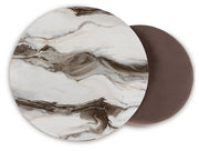 Ultra-contemporary design, everyday convenience. This trend-forward nesting coffee table completes your confidently curated living room with its marble-patterned top and eye-catching brass-tone frame. Dark wood grain on the legs provides a beautiful contrast. Paired with a nesting ottoman in chocolate brown velvet upholstery, this piece serves up must-have function in sophisticated style.