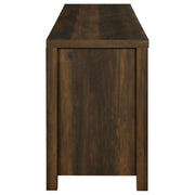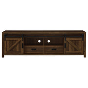 Wood-like finishes and country-inspired elements create this rustic style TV console. Keep entertainment consoles, a stereo and more tucked neatly within two open shelves toward the center. Disguised by sliding barn doors mounted on black hardware that lend an industrial touch, this television console also stores away entire collections of movies, games and music. With its long rectangular design and clean square edges, this console furniture piece makes an excellent addition to entertainment rooms and living rooms. This TV console makes a charming, versatile piece for your entire entertainment system setup. Key Features: • Seventy-nine inch TV stand with rustic distressed pine wood appearance • Sliding barn doors reveal hidden compartments for organized storage • Black metal hardware adds industrial contrast to farmhouse styling • Two center shelves provide open display space for electronics or décor • Constructed from engineered wood, metal, and durable veneer surfaces • Perfect centerpiece for rustic, transitional, or modern living spaces