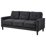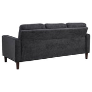 This modern sofa invites relaxation with its crisp profile and playful charm. Slim track arms trimmed in cord welt frame plush, grid-tufted cushions for visual appeal and cozy support. Wrapped in softly textured upholstery, it brings warmth and comfort to smaller living areas. Pocket coil seating ensures supportive structure, while tapered legs create a lifted, stable foundation ideal for everyday lounging. Key Features: • Sofa features slim track arms and grid-tufted cushions for tailored charm and cozy support • Rust finish adds contemporary appeal with a softly textured look and tonal versatility • Cord welt trim outlines each arm and cushion for added structure and subtle definition • Pocket coil seat construction provides lasting comfort with excellent shape retention • Fabric upholstery offers a soft, woven texture that's smooth to the touch and easy to maintain • Sturdy tapered plastic legs give this sofa a stable lift and simple modern foundation