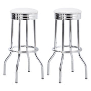 Bring nostalgic charm to your home with this retro swivel bar stool, blending diner-inspired design with modern comfort. A round padded seat in white leatherette pairs effortlessly with a ribbed chrome apron for vintage appeal. The electroplated chrome base provides stability with flared legs and a supportive footrest. Crafted from heavy gauge metal and cushioned with foam, it offers smooth 360-degree swivel functionality perfect for everyday use. Key Features: • Retro-style swivel bar stool adds vintage appeal to casual dining spaces • Electroplated chrome base features ribbed apron for iconic mid-century flair • Smooth 360-degree swivel function provides flexible seating and easy movement • Padded round seat upholstered in soft, easy-to-clean white leatherette • Durable construction with heavy-gauge metal and supportive foam cushioning • Circular footrest and flared legs offer added stability and timeless style
