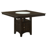 This counter height dining table brings striking form and smart utility to modern dining spaces. A frosted glass lazy Susan crowns the square tabletop, offering effortless access for shared meals and conversation. Below, the pedestal base conceals ample storage with a built-in wine rack and stemware holder. Crafted from rubberwood, engineered wood, and okume veneer, it blends durability with elegant presence—perfect for casual entertaining. Key Features: • "Square counter height table with built-in lazy Susan for shared serving convenience • Cappuccino wood finish complements the modern grid-panel base with warm elegance_x005F_x000D_ • Rotating frosted glass centerpiece enhances function and visual sophistication_x005F_x000D_ • Integrated cabinet with wine rack and stemware holders keeps essentials close_x005F_x000D_ • Made from rubberwood, engineered wood, and okume veneer for durability_x005F_x000D_ • Ideal for stylish kitchens or dining rooms seeking smart storage and charm