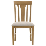 A fresh take on familiar tradition, this dining side chair pairs soft contours with classic craftsmanship. The sculpted slat back design adds character and support, while the padded light tan seat cushion provides lasting comfort. Framed in solid rubberwood with engineered wood accents and a light brown finish, this chair offers a relaxed yet polished look that fits effortlessly into casual or transitional dining spaces. Key Features: • Dining side chair features a sculpted slat back with a gently curved top rail • Light tan padded seat cushion provides lasting support and subtle contrast • Crafted from solid rubberwood, engineered wood, and foam for durability and comfort • Natural light brown finish highlights wood grain and adds warmth to the frame • Tapered legs and supportive stretchers offer strength and visual balance • Blends well with traditional, rustic, and casual transitional dining table styles