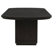 Rooted in quiet strength and sculptural beauty, this extension dining table brings graceful presence to every gathering. Its soft-edged rectangular top rests on a bold pedestal base, finished in burnished black for depth and contrast. When needed, a removable leaf extends the surface with the help of equalizing metal cable glides, allowing for smooth expansion. Whether hosting intimate dinners or festive occasions, this table adapts with effortless elegance. Key Features: • Rectangular extension table finished in burnished black with softened corners • Removable leaf extends the tabletop to nearly ninety-six inches with ease • Equalizing metal cable glides ensure smooth, balanced one-person operation • Architectural pedestal base provides sculptural support and open grounding • Elegant scale supports both everyday meals and larger dinner occasions • Constructed from ash veneer, rubberwood, and engineered wood